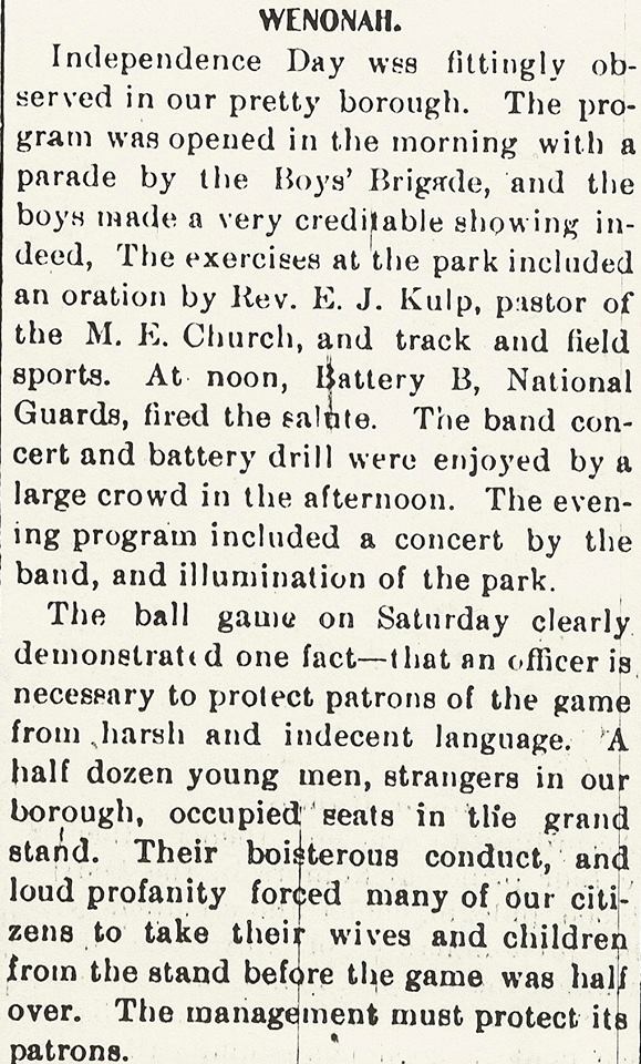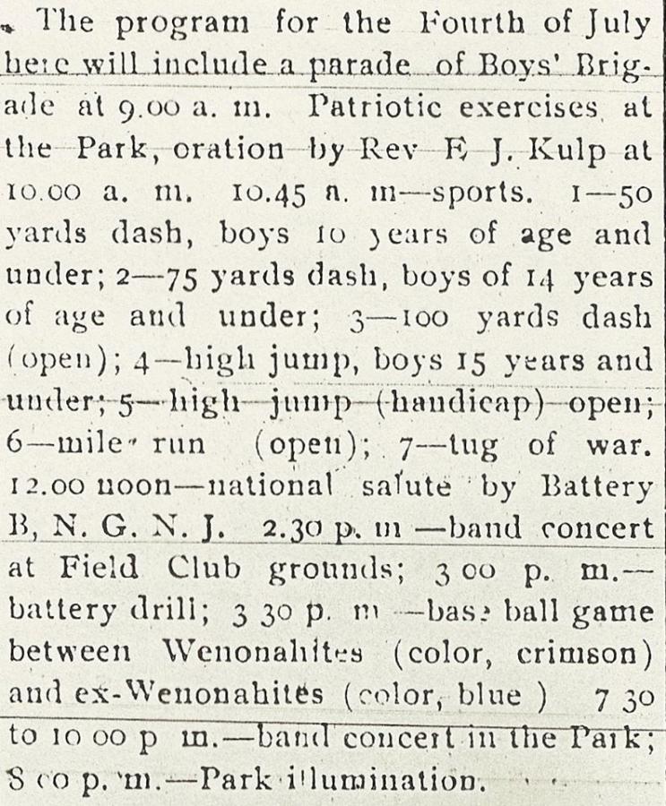 The ballgame seems to be a regular event in Wenonah's Independence Day celebration. Early contests saw Wenonah play a visiting team, "summer girls" play "summer boys," and single men play married men. In 1904, it was Wenonahites vs ex-Wenonahites. From the newspaper article on July 6, that match-up may not have been such a good idea.