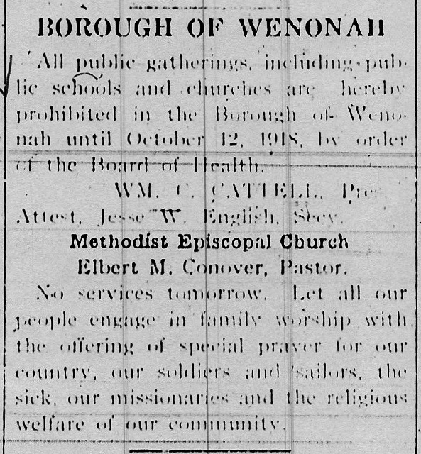 From this notice published in an unknown newspaper on October 1, 1918, public gatherings were prohibited in Wenonah from October 1-12.