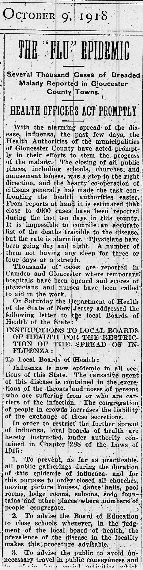 With the alarming spread of the disease, influenza, the past few days, the Health Authorities of the municipalities of Gloucester County have acted promptly in their efforts to stem the progress of the malady. The closing of all public places, including schools, churches and amusement houses, was a step in the right direction, and the hearty co-operation of citizens generally has made the task confronting the health authorities. easier. From reports at hand it is estimated that close to 4000 cases have been reported during the last ten days in this county. It is impossible to compile an accurate list of the deaths tracáble to the disease, but the rate is alarming. Physicians have been going day and night. A number of them not having any sleep for three or four days at a stretch.