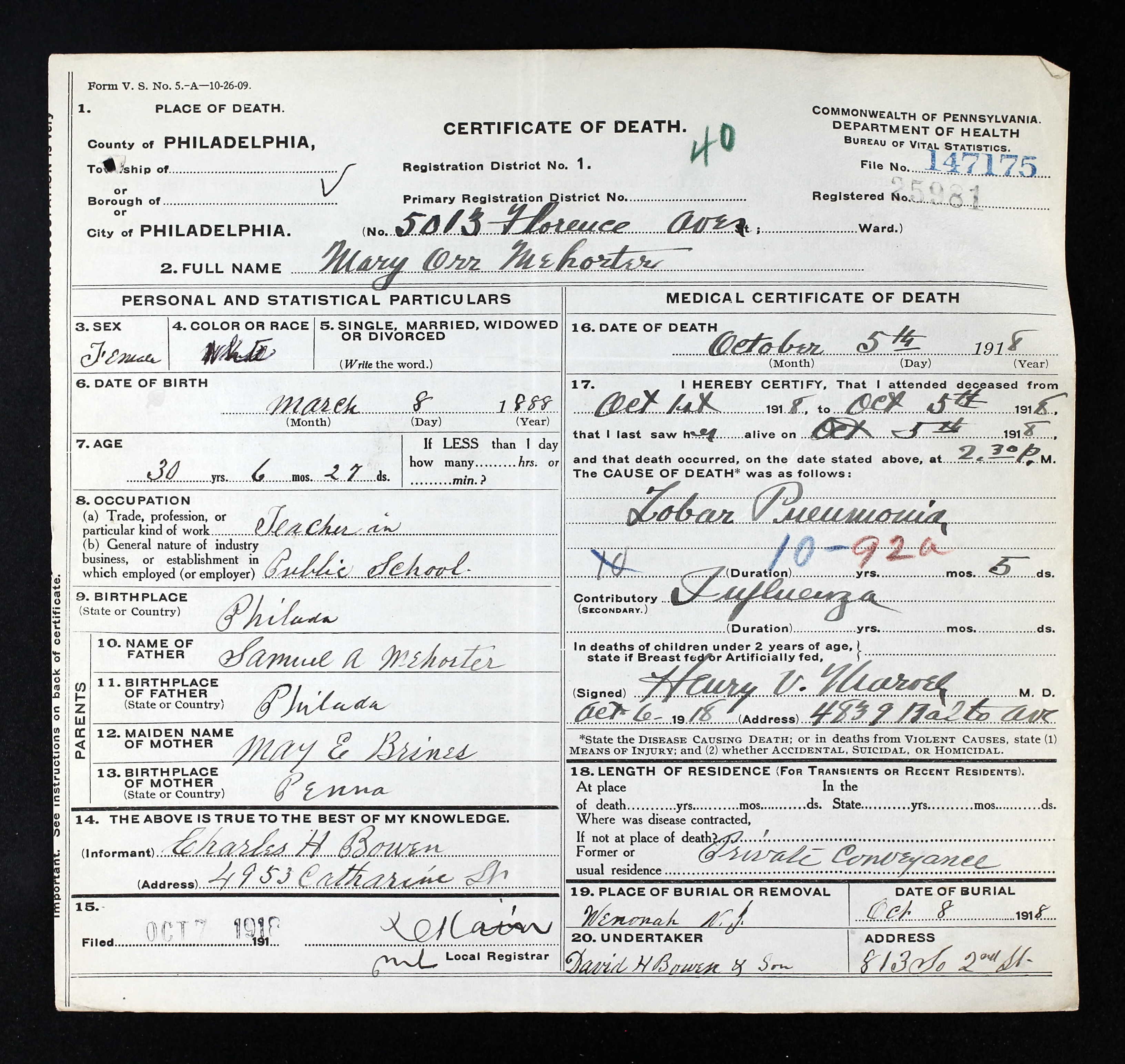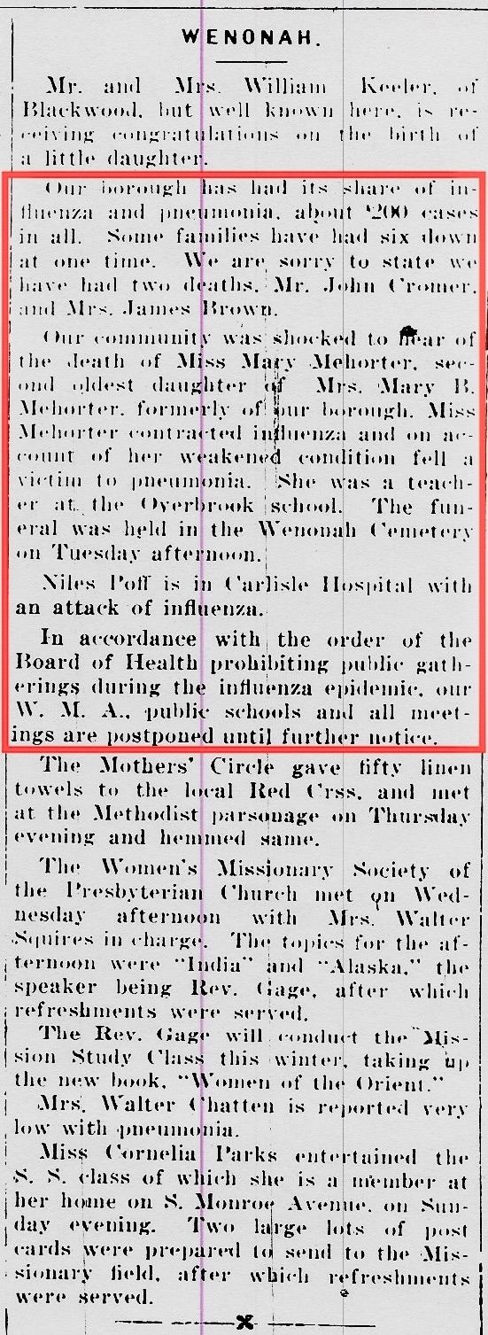 Our community was shocked to hear of the death of Miss Mary Mehortor. Second oldest daughter of Mrs. Mary B. Mohorter. formerly of our borough. Miss Mehortor contracted influenza and on account of her weakened condition fell a victim to pneumonia. She was a teacher at the Overbrook school. The funeral was held in the Wenonah Cemetery on Tuesday afternoon.